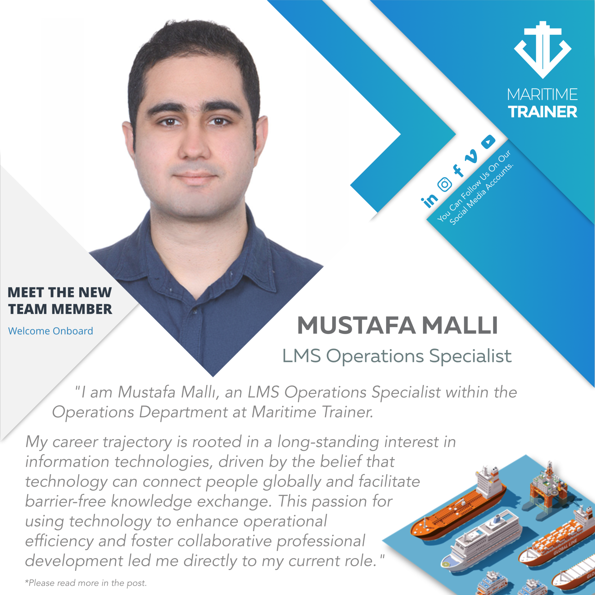 "I am Mustafa Mallı, an LMS Operations Specialist within the Operations Department at Maritime Trainer. My career trajectory is rooted in a long-standing interest in information technologies, driven by the belief that technology can connect people globally and facilitate barrier-free knowledge exchange. This passion for using technology to enhance operational efficiency and foster collaborative professional development led me directly to my current role."